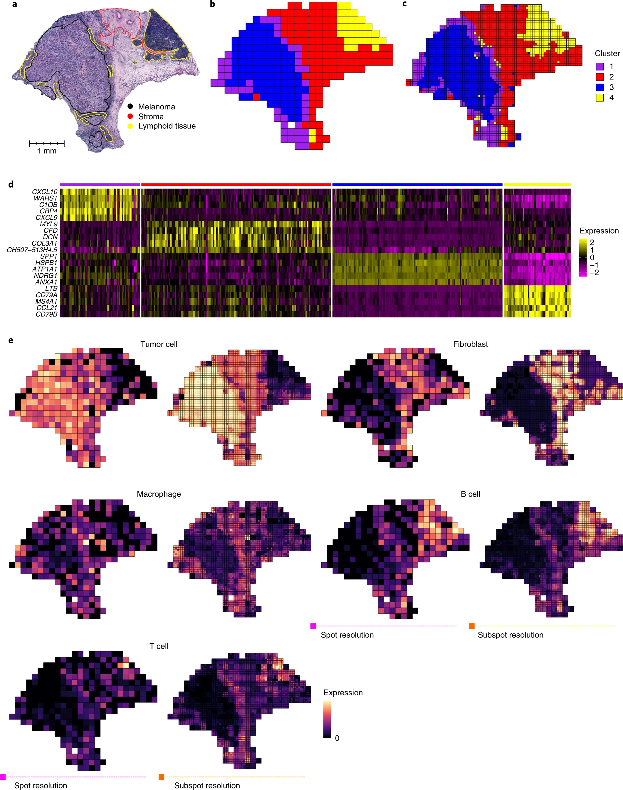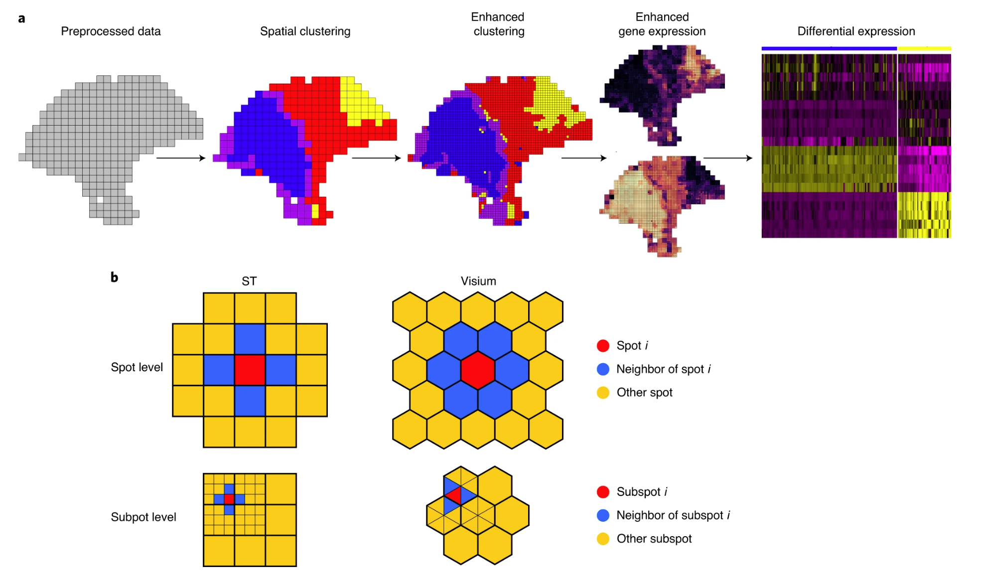 To enhance the resolution of the clustering map, we segmented each spot into subspots and again leveraged spatial information using the potts model spatial prior.