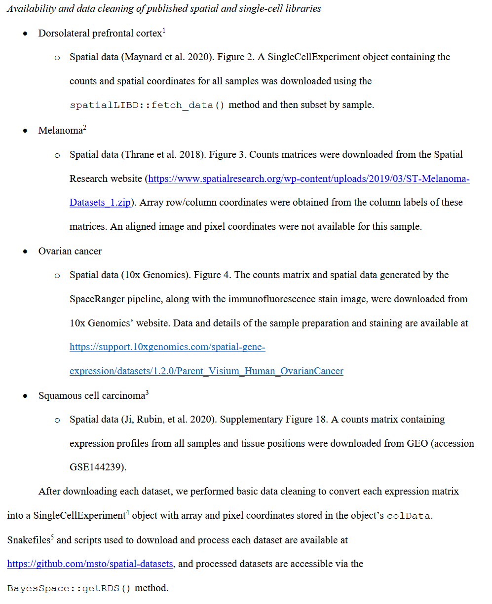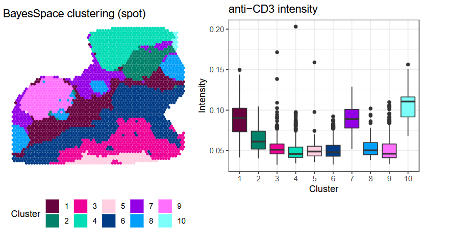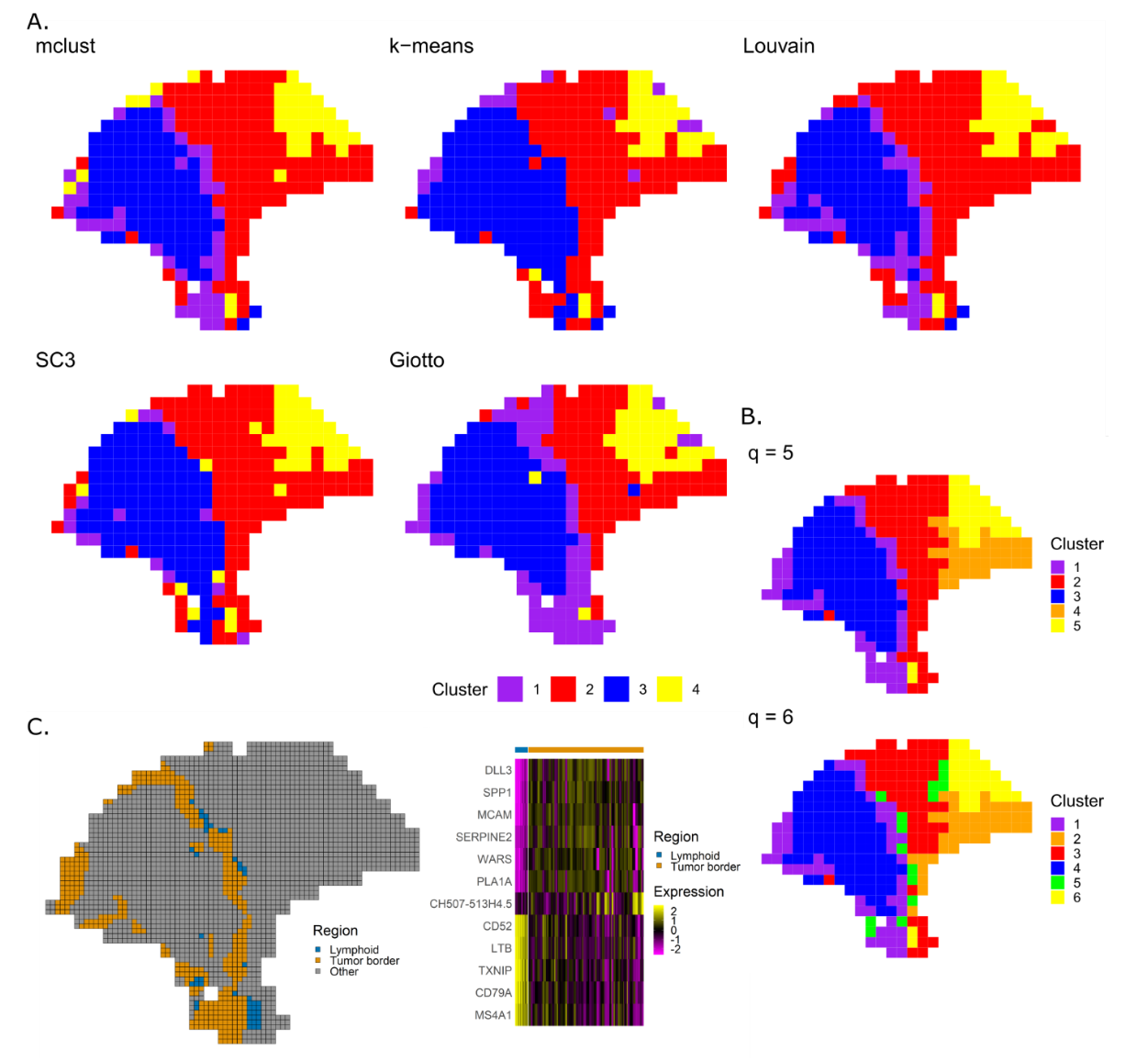 BayesSpace is a spatial transcriptomic model-based clustering method that uses a t-distributed error model to identify spatial clusters that are more robust to the presence of outliers caused bytechnical noise.