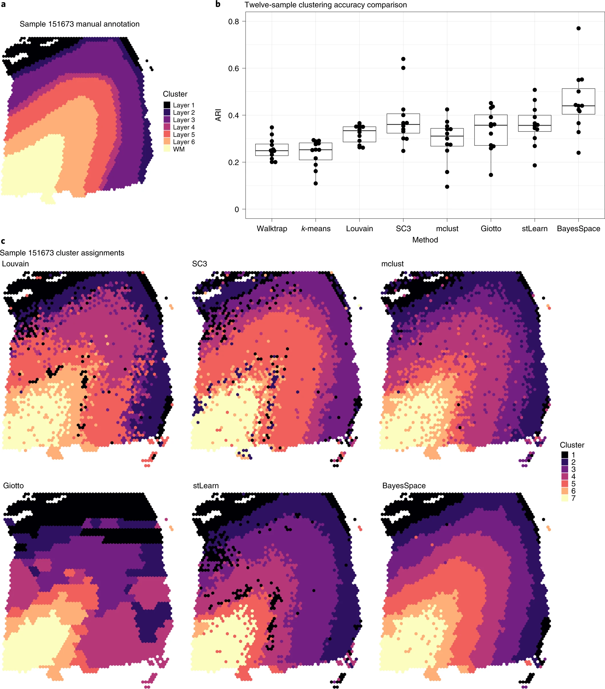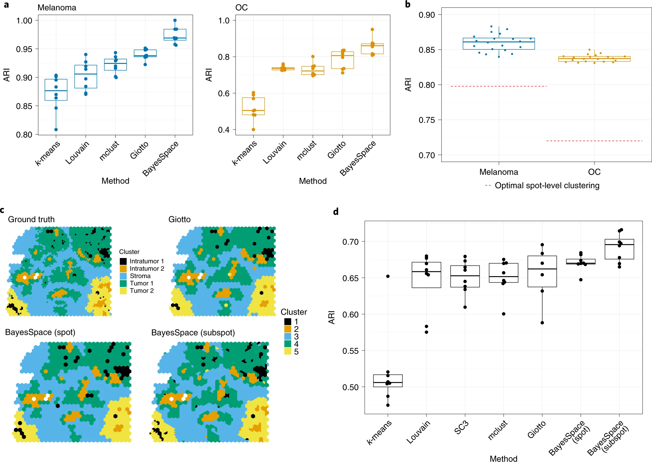 b 图:In N = 20 replicates for the simulation performed at the subspot level, BayesSpace enhanced clustering outperforms the optimal spot-level clustering (red dotted line)