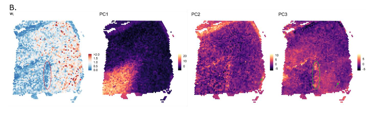 上图是 The spatial distribution of 's is shown for sample 151673. 可以看到许多可见的在 PC2 和 PC3 的突出点被 downweighted 了。