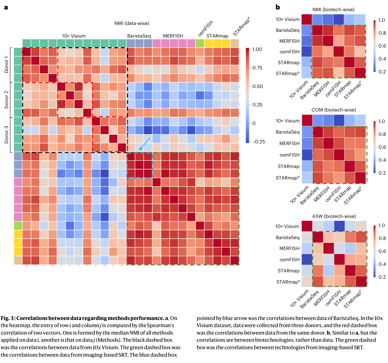 Through the analysis of methods performance across different data, we have observed interesting correlation patterns as determined by the Spearman correlation coefficient, underlining the relative ordering of their performance (Fig. 3a, the underlying metrics values can be found in Extended Data Fig. 2). First, we found that, within the same spatial technology, a strong Spearman correlation emerged when mul- tiple data samples originated from the same individual and shared identical tissue structure. A notable example of this is the high consist- ency in the relative performance of all methods applied on three BaristaSeq datasets (Fig. 3a, blue box).