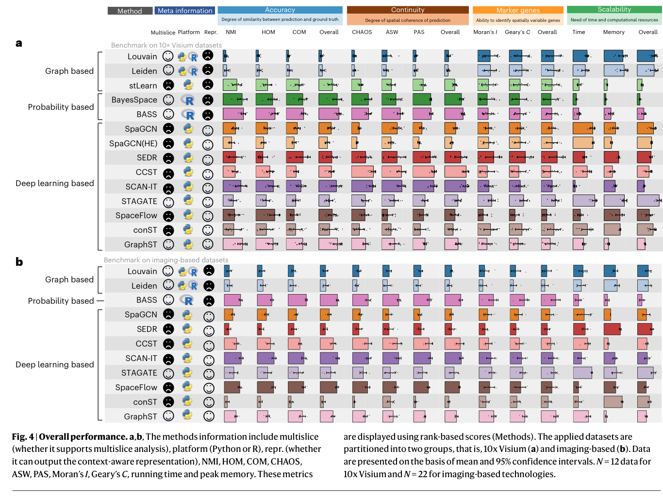 这篇文章主要是针对 13 种对于在 34 个 SRT (spatially resolved transcriptomics) 的数据的计算方法做了 benchmark study,并针对 accuracy,sptial continuity,marker genes detection,scalability,and robustness 做了评估。针对各个方法的特点提出了自己的选择建议。并在最后提出了自己针对大规模数据的 Method。