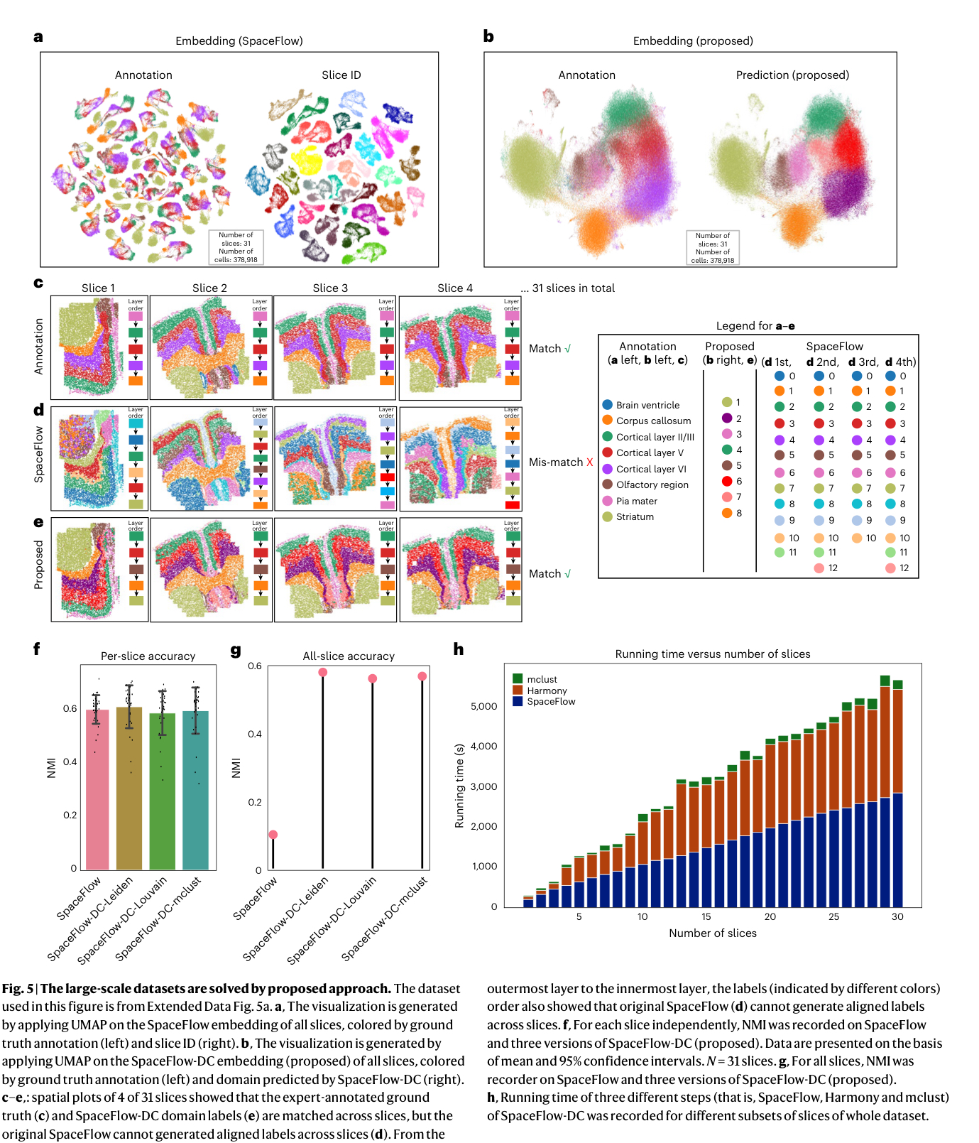 UMAP 和批次效应:为了观察是否存在批次效应(不同批次之间的系统差异),他们将所有 31 个切片的嵌入拼接在一起,使用 UMAP 进行可视化,结果显示了批次效应的存在(见 Fig. 5a)。
