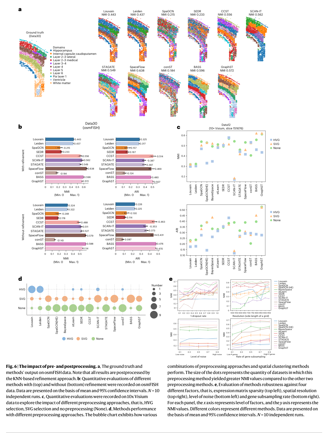 最后,作者检测了鲁棒性和其它因素 (gene expression matrix sparsity, spatial resolution, the number of genes and the level of noise), 也检测了 pre- and postpocessing steps on diffenrent methods' performance.