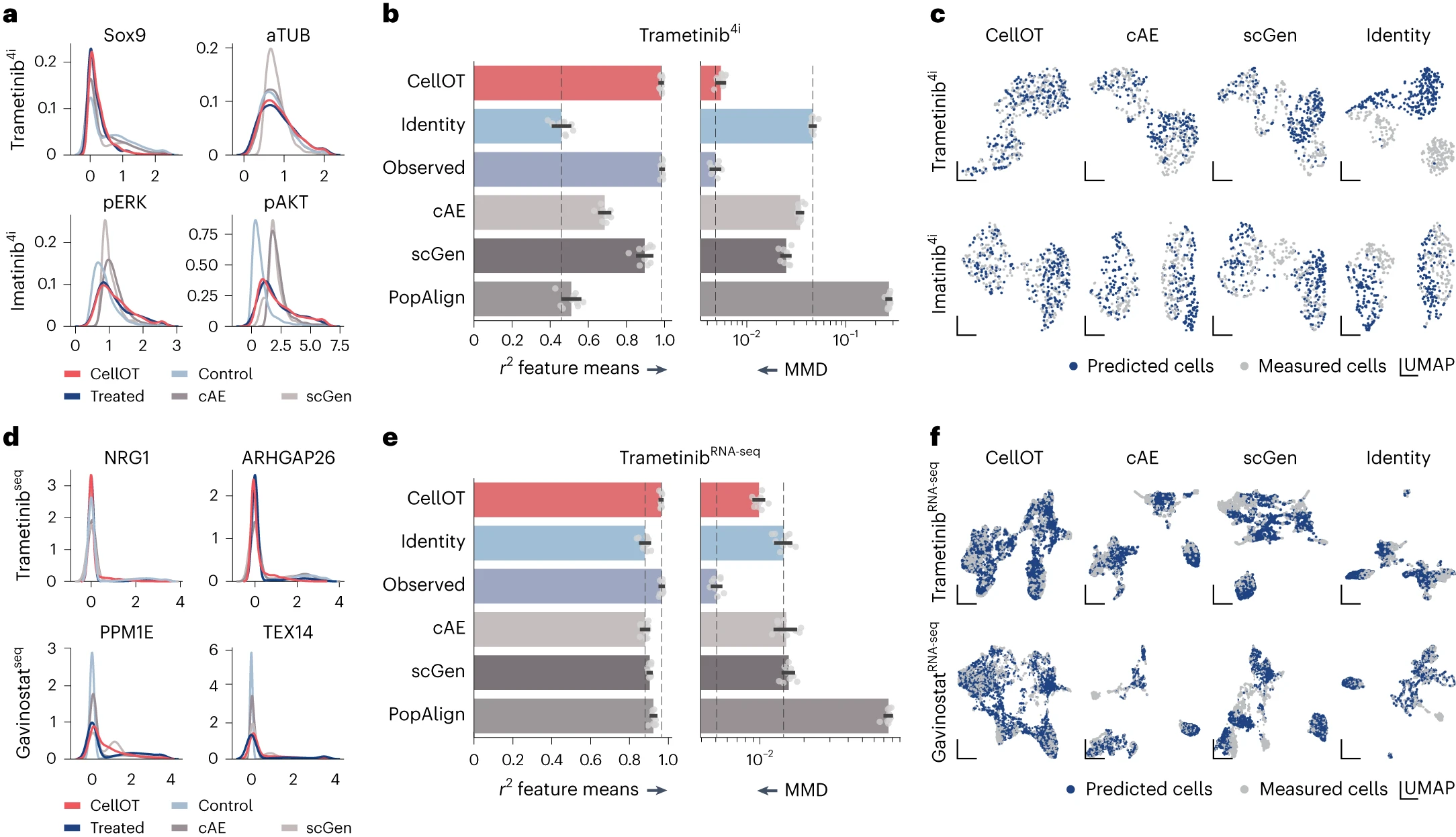 这里的图 a 和 d 主要是看 CellOT 的线和 Treated 的线的重合程度。而且这里越重合越能说明 CellOT 更好的把握到了里面细微的结构。