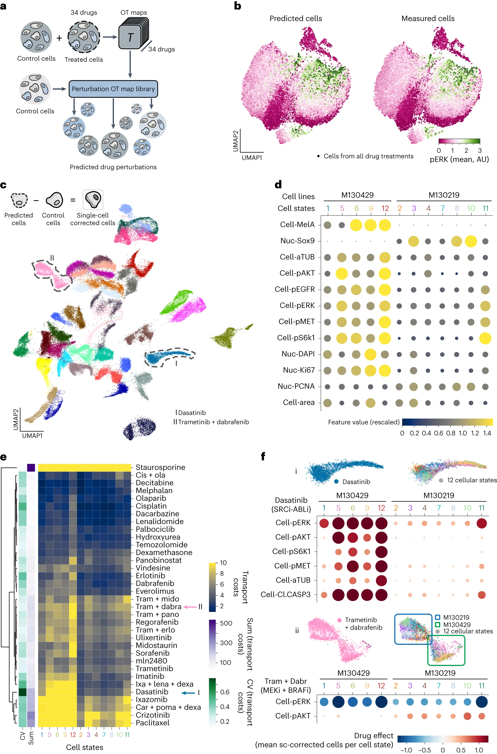 上面的图 c 表示,CellOT 可以通过计算预测细胞和 control 细胞的差分来分离每种药物的作用模式。