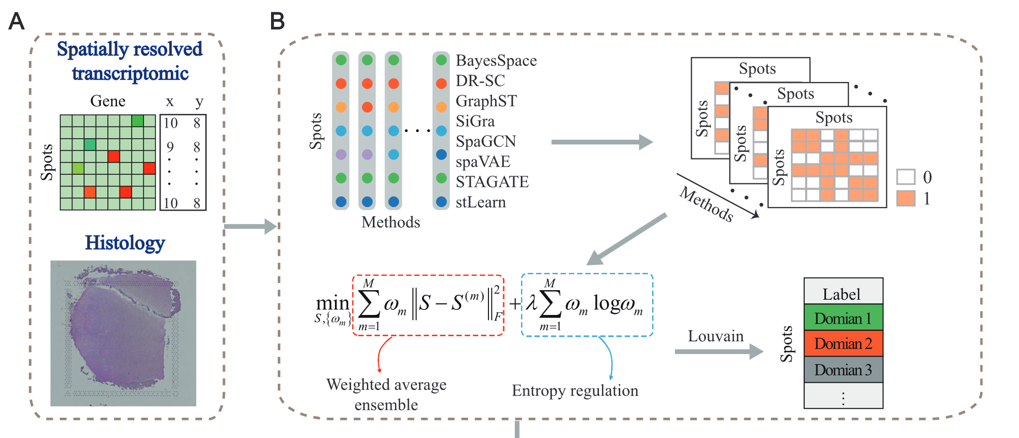 - 提出 EnSDD (Ensemble-learning for Spatial Domain Detection),整合 8 种先进的空间域检测方法,并使用 动态加权机制 来优化每种方法的贡献。