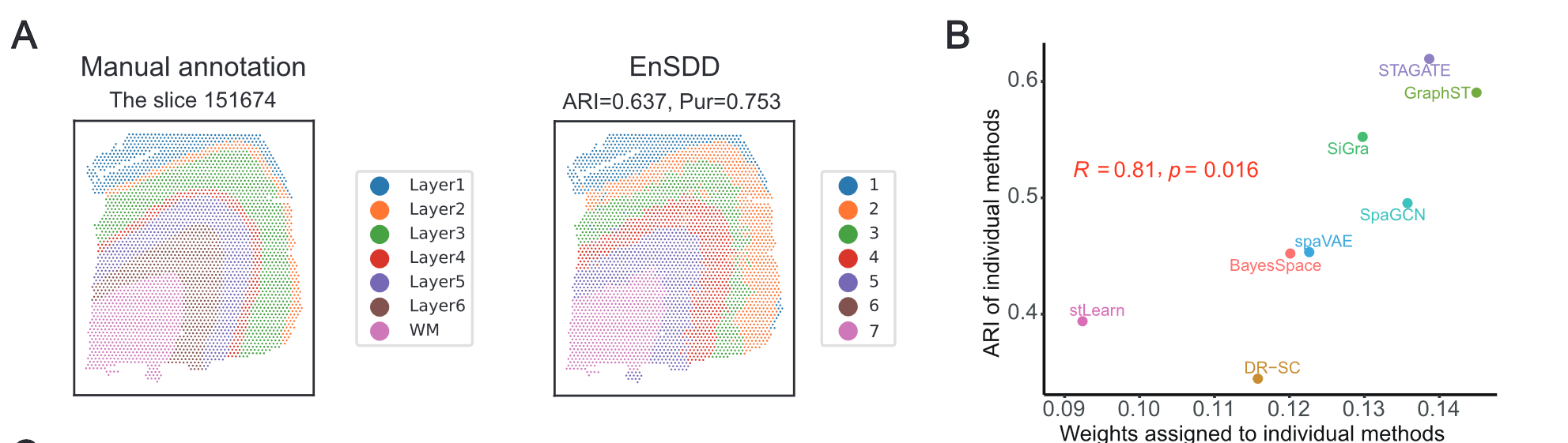 - 以 调整兰德指数(ARI)= 0.637 和 纯度(Purity)= 0.753 在部分切片中取得最高聚类准确度。