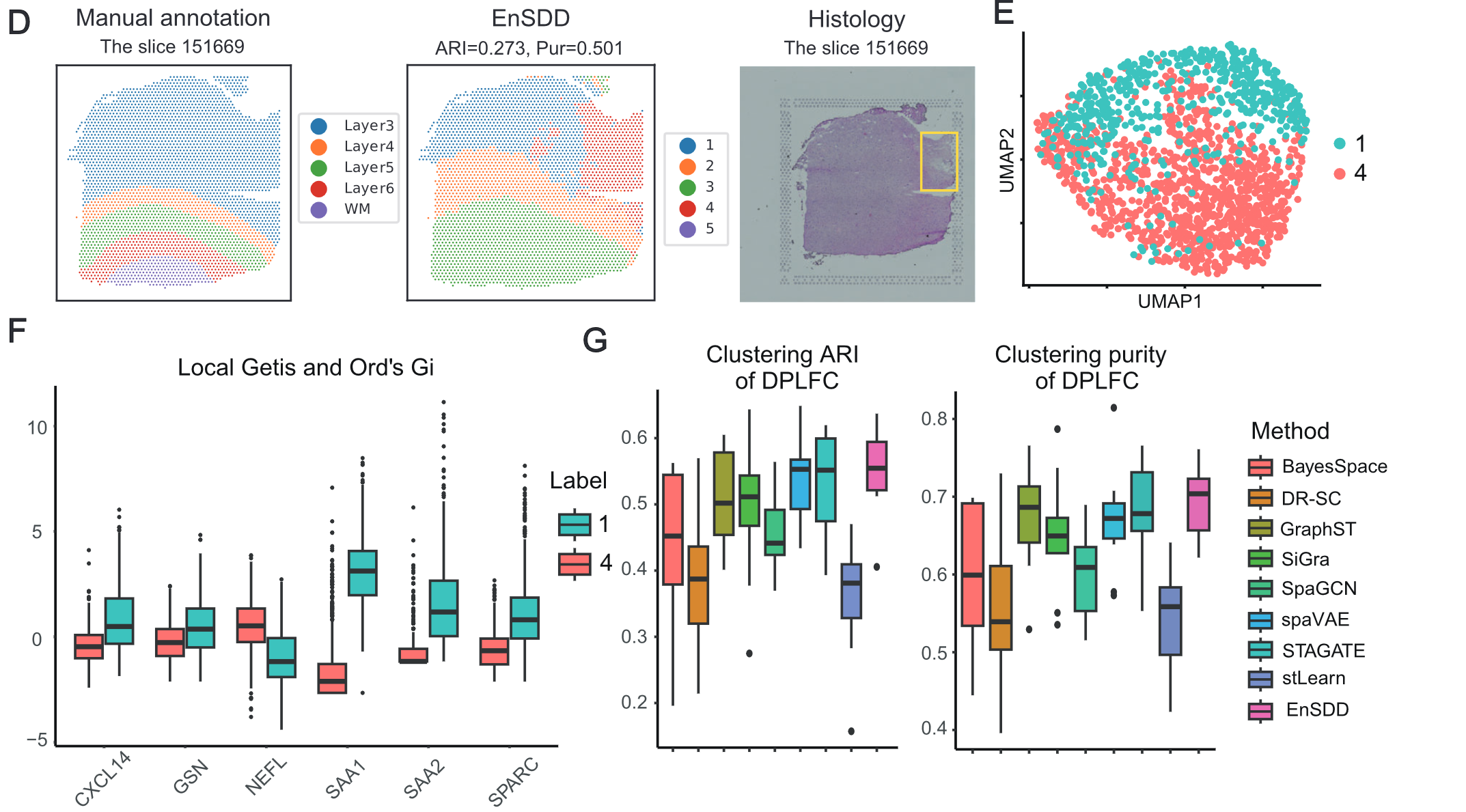 - EnSDD 在 12 个人类 DLPFC(前额叶皮层)切片上进行测试,结果显示: