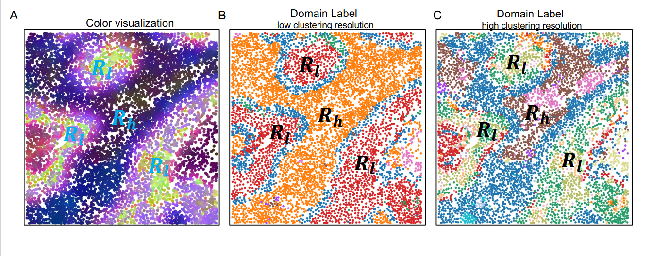 这张图片表示了对于同一个 spatial domain 也能体现出细胞 context 的 variation。对于后两个图片是基于不同的分辨率得到的。