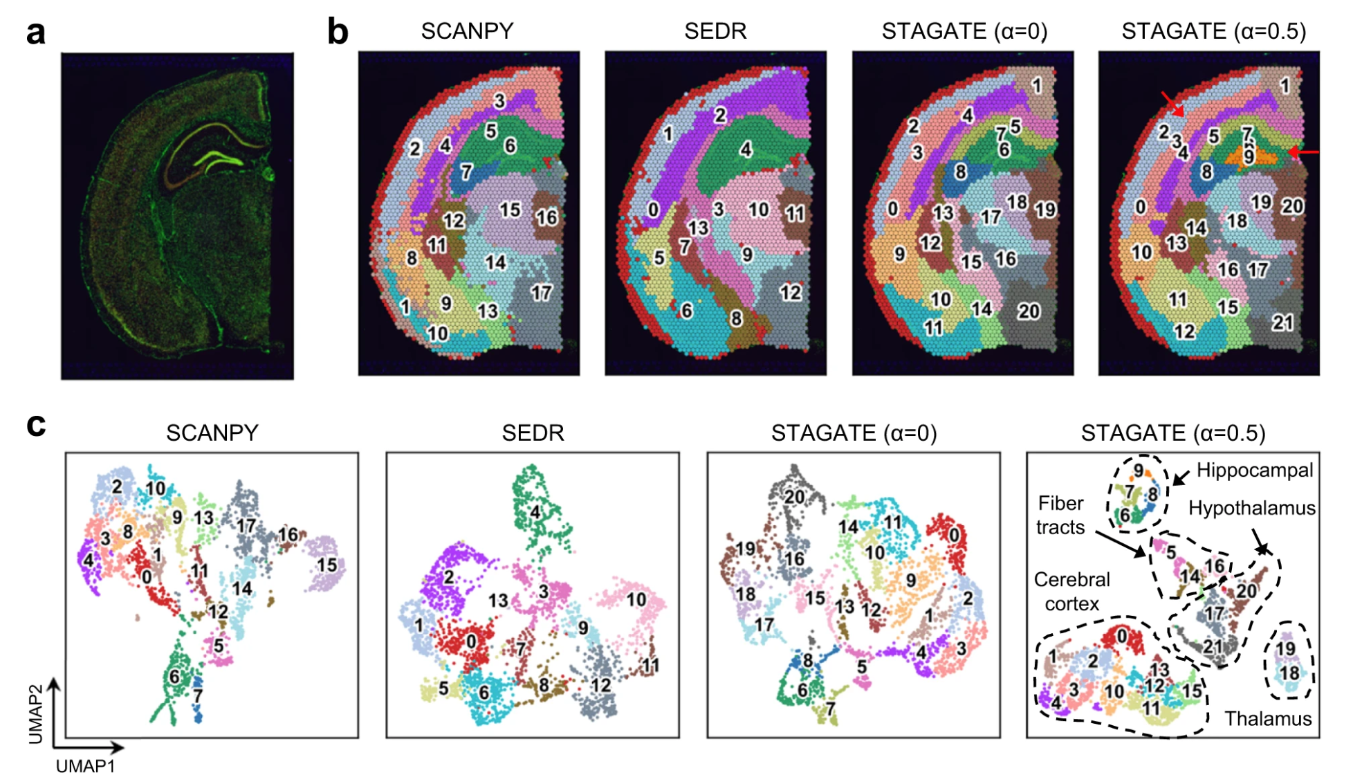 在 c 图中也能发现,使用了 cell type-aware 模块的 STAGATE 对于 UMAP plot 的操作,更进一步分割了组织结构