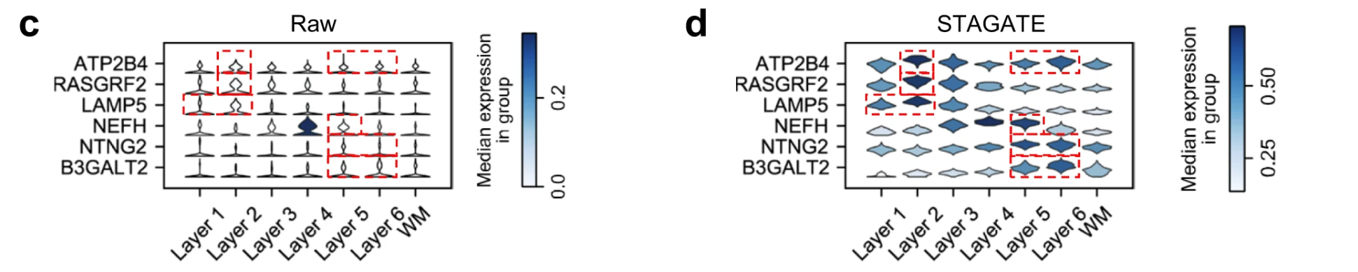 the denoised ones by STAGATE exhibited the laminar enrichment of these layer-marker genes clearly. For example, after denoising, the ATP2B4 gene showed differential expressions in layer 2 and 6, which is consistent with previously reported results, while its raw spatial expression is completely messy.