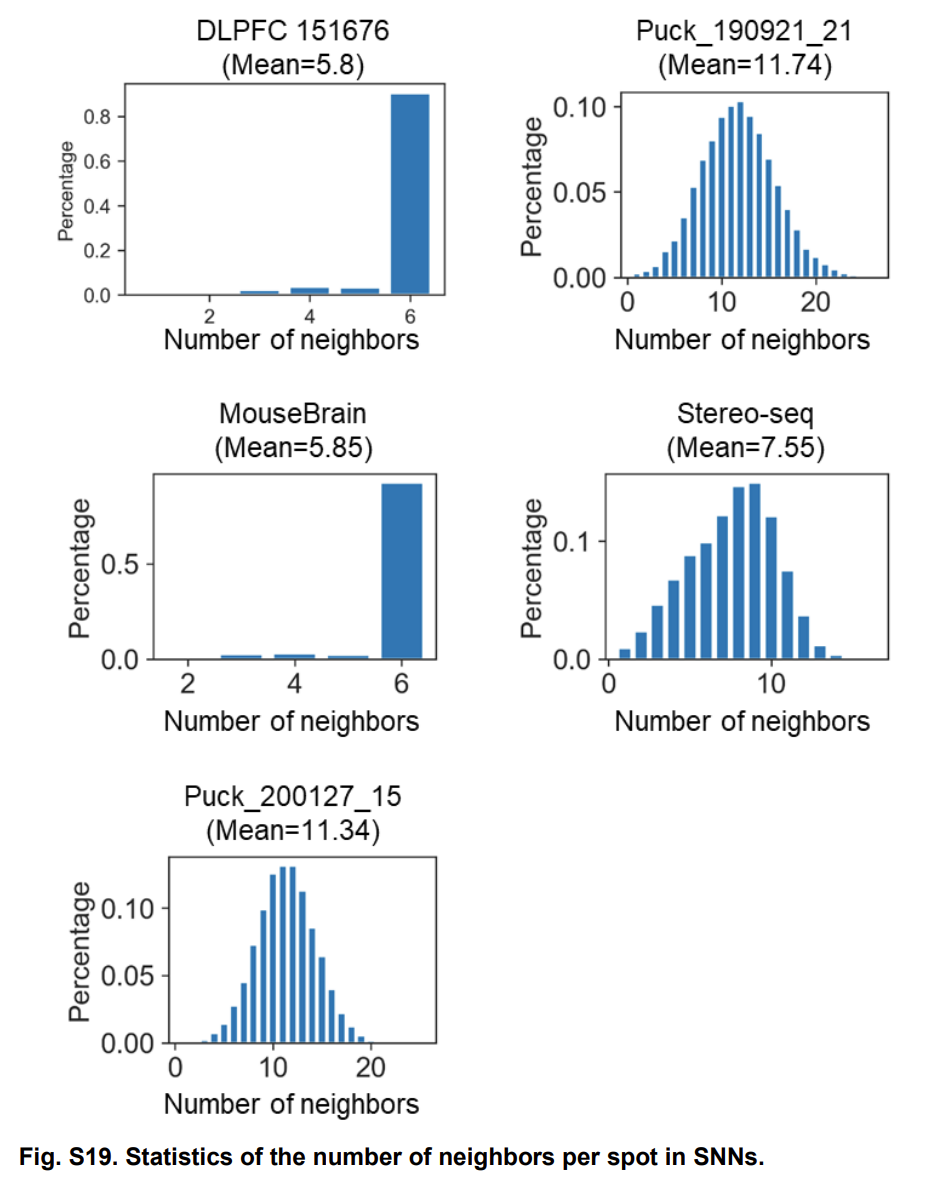对于 10x visium data, 我们直接选择最近的 6 个邻居,对于其它的数据,我们根据经验选择,让这个范围内包括 6-15 个邻居。