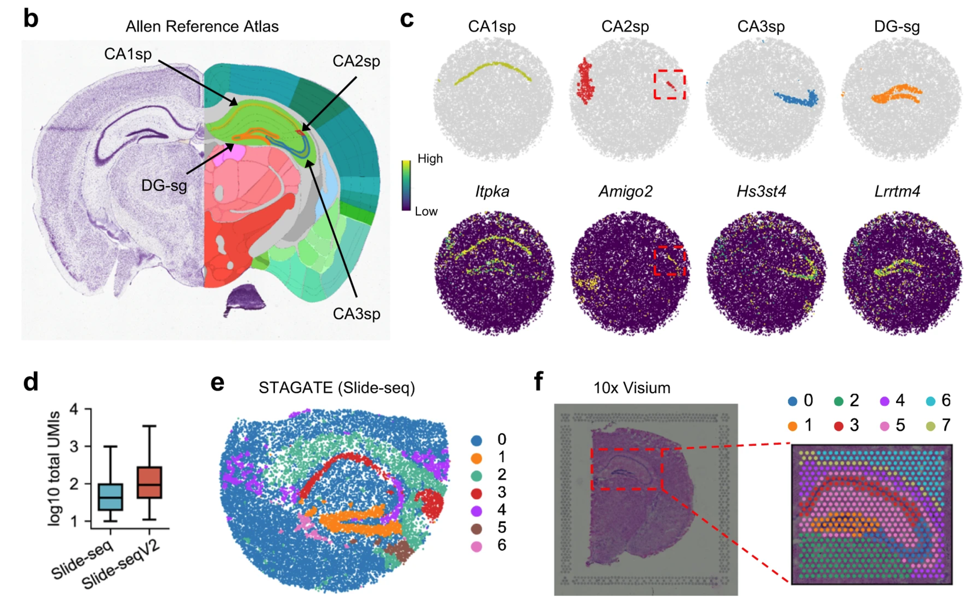 STAGATE depicted the known tissue structures wll except CA2sp on the Slide-seq data(e) and 10x Visium data(f) respectively.