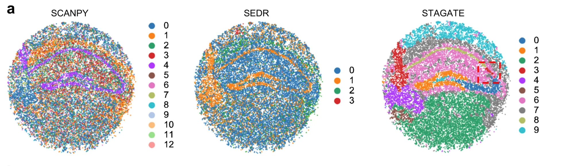 STAGATE can well characterize the tissue structures and uncover the spatial domains, while the clusters identified by SCANPY and SEDR lack clear spatial separation.