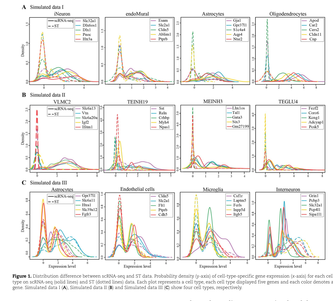 采用 Simulated Data III . 对于每种细胞类型,我们检查属于该类型的细胞中细胞类型特异性基因的表达水平,然后比较相同基因在 scRNA-seq 和 ST 数据中的概率密度分布。