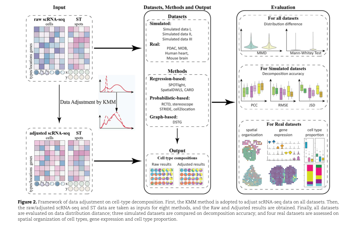本文设计的基于实例的迁移学习框架通过 ST 数据调整 scRNA-seq 数据,以改进分解,采用核平均匹配方法