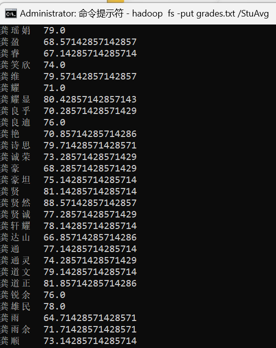 # ClassAvg1 2 3 4 5 6 7 8 9 10 mvn clean mvn package hadoop fs -mkdir /ClassAvg hadoop fs -put grades.txt /ClassAvg hadoop jar ./target/ClassAvg.jar com.ls.ClassAvg /ClassAvg/grades.txt /output2 hadoop fs -ls /output2 hadoop fs -cat /output2/part-r-00000 hadoop fs -rm -r /output2