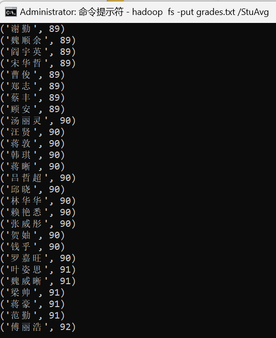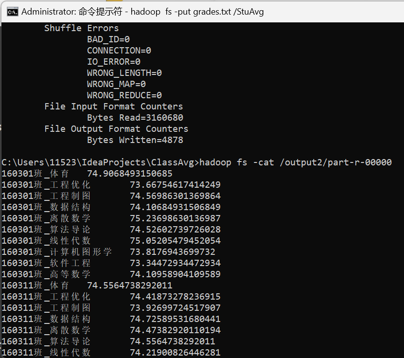 # 具体指令# 打开 hadoop# StuAvg1 2 3 4 5 6 7 8 9 10 mvn clean mvn package hadoop fs -mkdir /StuAvg hadoop fs -put grades.txt /StuAvg hadoop jar ./target/StuAvg.jar com.ls.StuAvg /StuAvg/grades.txt /output1 hadoop fs -ls /output1 hadoop fs -cat /output1/part-r-00000 hadoop fs -rm -r /output1