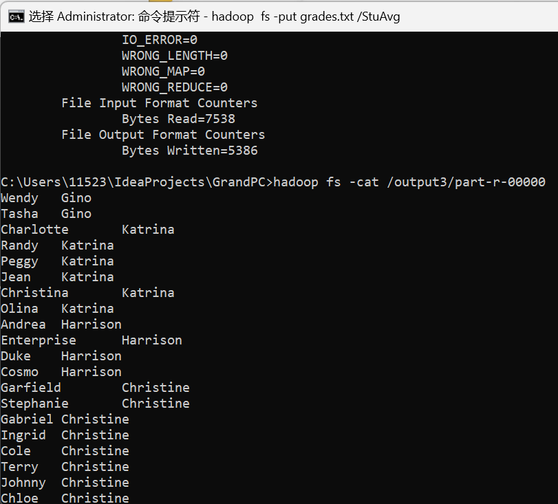 # GrandPC1 2 3 4 5 6 7 8 9 10 mvn clean mvn package hadoop fs -mkdir /GrandPC hadoop fs -put child-parent.txt /GrandPC hadoop jar ./target/GrandPC.jar com.ls.GrandPC /GrandPC/child-parent.txt /output3 hadoop fs -ls /output3 hadoop fs -cat /output3/part-r-00000 hadoop fs -rm -r /output3