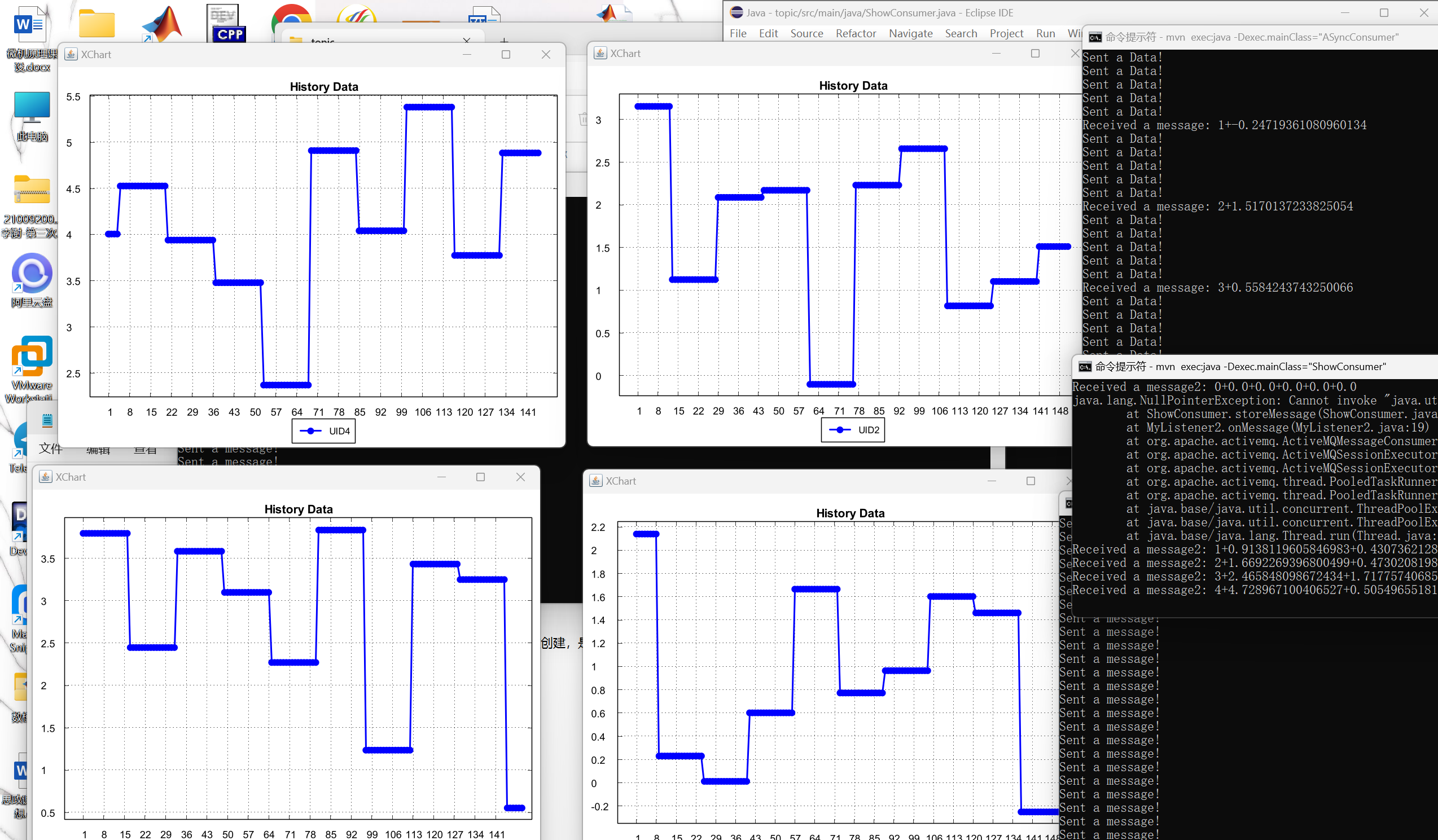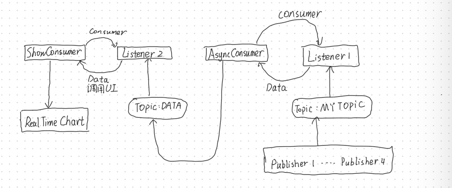 public void paint ( ) { for ( int i = 1 ; i < 6 ; i ++ ) { if ( arrayOfLists[i][4].size() != 0 ) chart[i].plot(arrayOfLists[i][4].get(arrayOfLists[i][4].size()-1)); } } public void storeMessage ( String message ) { String[] parts = message.split("\\+") ; String uidPart = parts[0] ; String meanPart = parts[1] ; String variancePart = parts[2] ; String maxPart = parts[3] ; String minPart = parts[4] ; String curPart = parts[5] ; int uid = Integer.parseInt(uidPart) ; double mean = Double.parseDouble(meanPart) ; double variance = Double.parseDouble(variancePart) ; double Max = Double.parseDouble(maxPart) ; double Min = Double.parseDouble(minPart) ; double cur = Double.parseDouble(curPart) ; arrayOfLists[uid][0].add(mean) ; arrayOfLists[uid][1].add(variance) ; arrayOfLists[uid][2].add(Max) ; arrayOfLists[uid][3].add(Min) ; arrayOfLists[uid][4].add(cur) ; } public static void main(String[] args) throws JMSException { ShowConsumer consumer = new ShowConsumer ( ) ; String brokerURL = "tcp://localhost:61616"; ConnectionFactory factory = null; Connection connection = null; Session session = null; Topic topic = null; MessageConsumer messageConsumer = null; MyListener2 listener = null; try { factory = new ActiveMQConnectionFactory(brokerURL); connection = factory.createConnection(); session = connection.createSession(false, Session.AUTO_ACKNOWLEDGE); topic = session.createTopic("DATA");