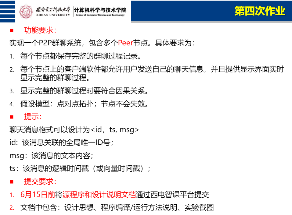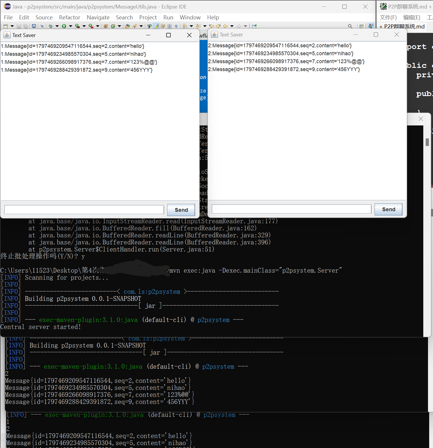 # JAVA 程序# Client.java1 2 3 4 5 6 7 8 9 10 11 12 13 14 15 16 17 18 19 20 21 22 23 24 25 26 27 28 29 30 31 32 33 34 35 36 37 38 39 40 41 42 43 44 45 46 47 48 49 50 51 52 53 54 55 56 57 58 59 60 61 62 63 64 65 66 67 68 69 70 71 72 73 74 75 76 77 78 79 80 81 82 83 84 85 86 87 88 89 90 91 92 93 94 95 96 97 98 99 100 101 102 103 104 package p2psystem;import java.io.* ;import java.net.Socket;import com.google.gson.Gson; public class Client { private static final String SEVERADDRESS = "127.0.0.1" ; private static final int PORT = 8189 ; private static int clientNum = 1 ; private static int logicNum = 1 ; private static final Gson gson = new Gson () ; private static final int ACKseq = 1145141919 ; private static final int ACKnew = 1919810 ; private static final MessageQueue Mqueue = new MessageQueue ( ) ; private static TextSaverApp chat = new TextSaverApp ("chatgroup" ) ; private static int ClientName ; private static int ACKname = 0 ; public static void main ( String [] args ) throws Exception { Socket socket = new Socket ( SEVERADDRESS , PORT ) ; BufferedReader in = new BufferedReader ( new InputStreamReader ( socket.getInputStream() ) ) ; PrintWriter out = new PrintWriter ( socket.getOutputStream() , true ) ; BufferedReader consoleInput = new BufferedReader ( new InputStreamReader ( System.in ) ) ; new Thread ( ( ) -> { try { String serverMessageJson ; while ( ( serverMessageJson = in.readLine() ) != null ) { Message message = MessageUtils.deserialize(serverMessageJson) ; if ( message.getseq() == ACKseq ) { Mqueue.incrementIdCount(message) ; Message HeadMessage = Mqueue.getHeadMessage() ; int count = Mqueue.getMessageCount(HeadMessage.getId()) ; if ( count == clientNum ) { logicNum = logicNum + 1 ; chat.setLogicNum(logicNum) ; Mqueue.removeMessage(HeadMessage.getId()) ; chat.appendText(ClientName + ":" + HeadMessage.toString()); System.out.println ( HeadMessage.toString() ) ; } } else if ( message.getseq() == ACKnew ) { logicNum = logicNum + 1 ; chat.setLogicNum(logicNum) ; clientNum = (int )message.getId() ; if ( ACKname == 0 ) { ACKname = 1 ; ClientName = clientNum ; } System.out.println ( clientNum ) ; } else { Mqueue.addMessage(message) ; Message HeadMessage = Mqueue.getHeadMessage() ; int count = Mqueue.getBroadCount(HeadMessage.getId()) ; if ( count == 0 ) { Mqueue.incrementBroadCount(message) ; Message Hmessage = new Message ( message.getId() , ACKseq , message.getContent() ) ; String messageJson = MessageUtils.serialize(Hmessage) ; logicNum = Math.max(logicNum, message.getseq()) ; logicNum = logicNum + 1 ; chat.setLogicNum(logicNum) ; out.println(messageJson); } } } } catch ( IOException e ) { e.printStackTrace() ; } }).start ( ) ; Message infoM = new Message ( 0 , ACKnew , "Hello" ) ; String messageJso = MessageUtils.serialize(infoM) ; out.println ( messageJso ) ; String userInput ; while ( (userInput = consoleInput.readLine()) != null ) { Message message = new Message ( 0 , logicNum , userInput ) ; String messageJson = MessageUtils.serialize(message) ; logicNum = logicNum + 1 ; chat.setLogicNum(logicNum) ; out.println(messageJson); } } }