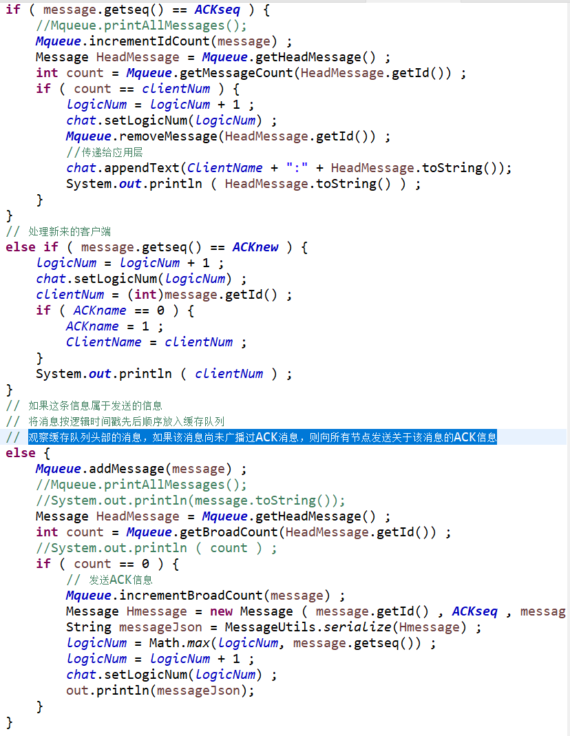 如果这条信息属于发送的信息,将消息按逻辑时间戳先后顺序放入缓存队列,观察缓存队列头部的消息,如果该消息尚未广播过 ACK 消息,则向所有节点发送关于该消息的 ACK 信息.