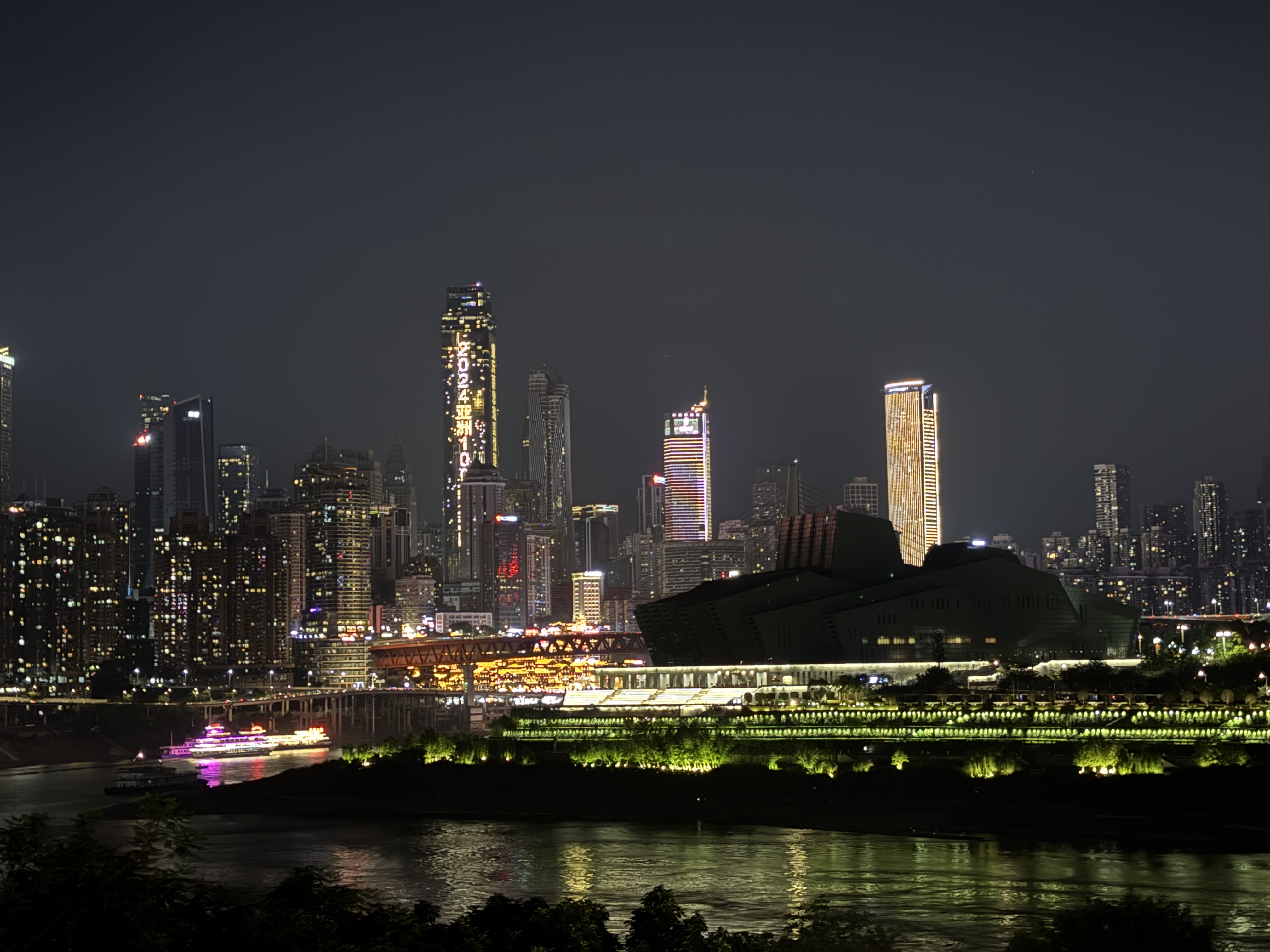 吃完烤串,我和我姐又去了重庆市规划展览馆上面去看了夜景,遗憾的是我们刚上去江对面的灯就熄了,没看到最漂亮的夜景。眺望江对岸有一种回到了上海外滩的感觉,各种各样的高楼大厦,游船在江上行驶,仔细一看楼上利用 LED 灯显示出各种各样的文字,景色也是十分不错了。