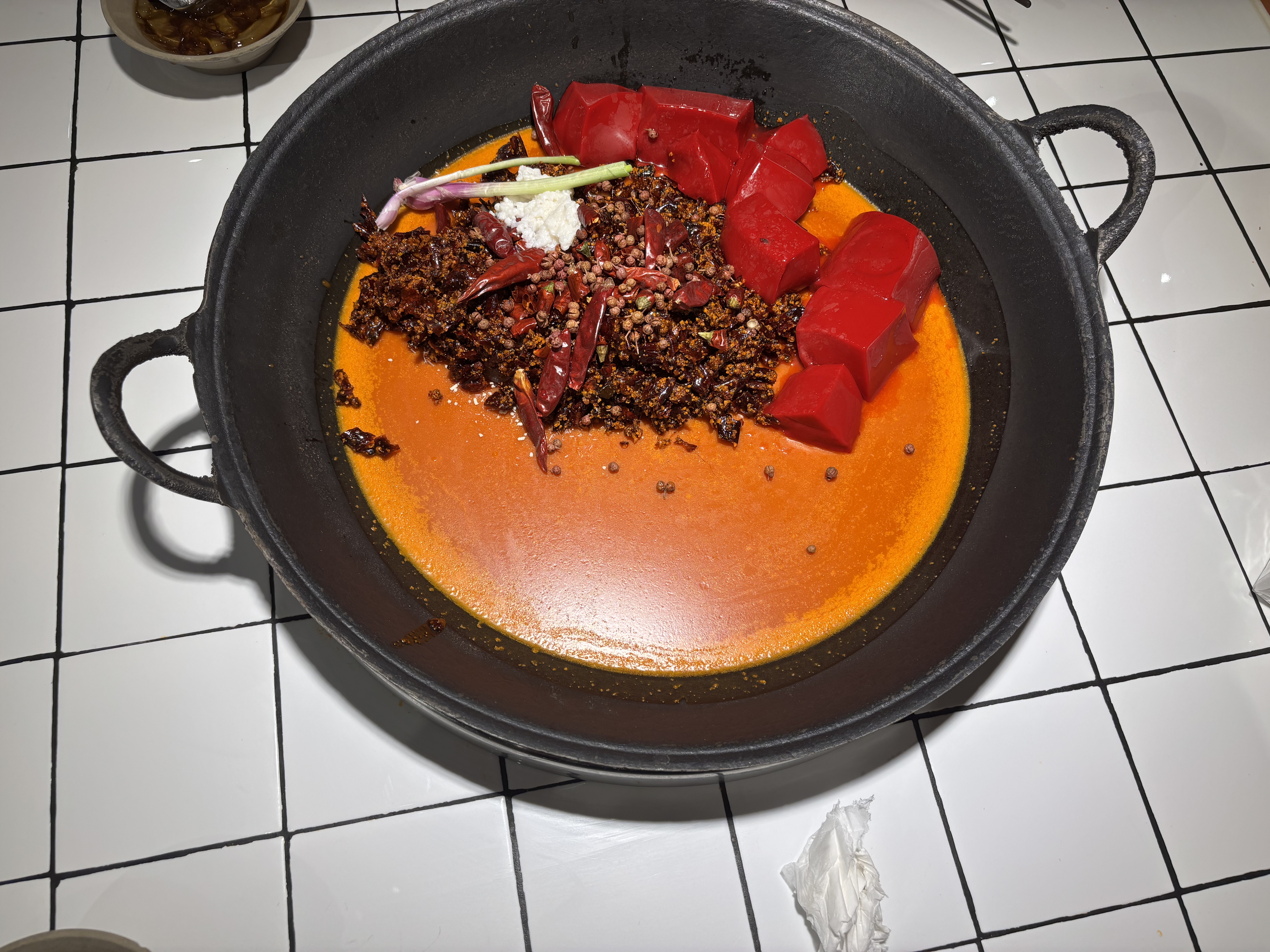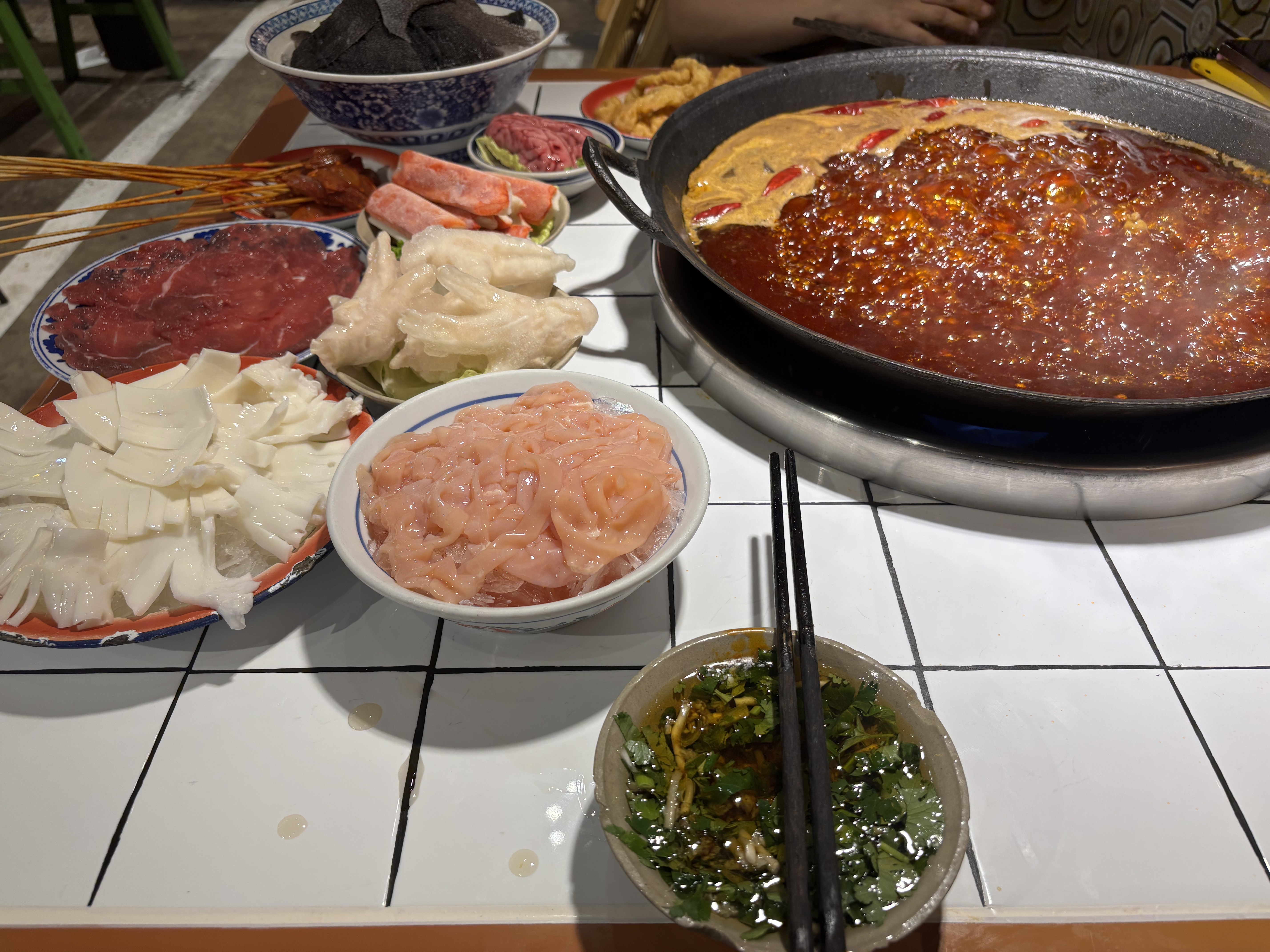 终于来到了最期待也最害怕的重庆火锅,点了个微辣,就这样给我吓得都不行。之前在网上看到过别人吃重庆火锅,听说鸭肠是必点的,这次也特地点了个鸭肠,店员推荐了他们的血旺,这个也试了一下。刚开始吃的时候并没有感觉到辣,重庆的辣更多的是香辣,并不是像其他地方模仿重庆火锅一样为了辣而辣,血旺十分好吃,在我的记忆当中算是最好吃的一次了,咬下去确实是入口即化。鸭肠也很不错,特意点的脑花原本以为会很腻吃起来也很不错。但是吃到后面辣味便涌上来了,奇怪的是一般辣的受不了是感觉刺痛刺痛的那种,但这次吃却没有那种感觉,它的辣似乎被其它材料 “包裹” 住了,虽说后面没有吃完,但确实重庆火锅十分不错。