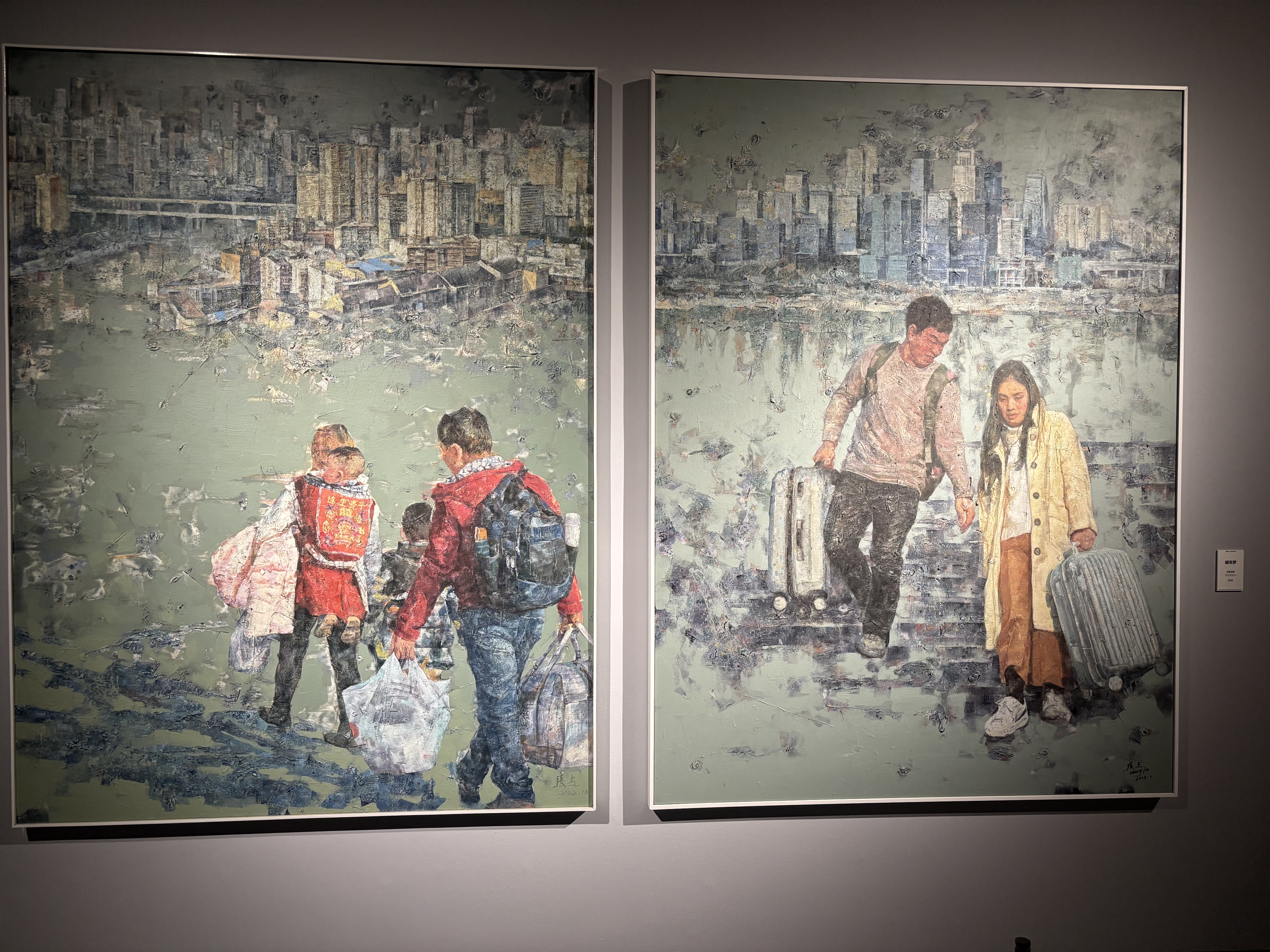 二楼的画是一个叫张杰的个人展,虽然没有完全的展示,但是水平相当不错,人物的眼神,表情相当讲究,栩栩如生,看的时候我便觉得为震撼。很好的把这种普通中国人的生活表现了出来,而且能看出有自己的思想在里面,特别是《城市梦》那两张,真是非常厉害。