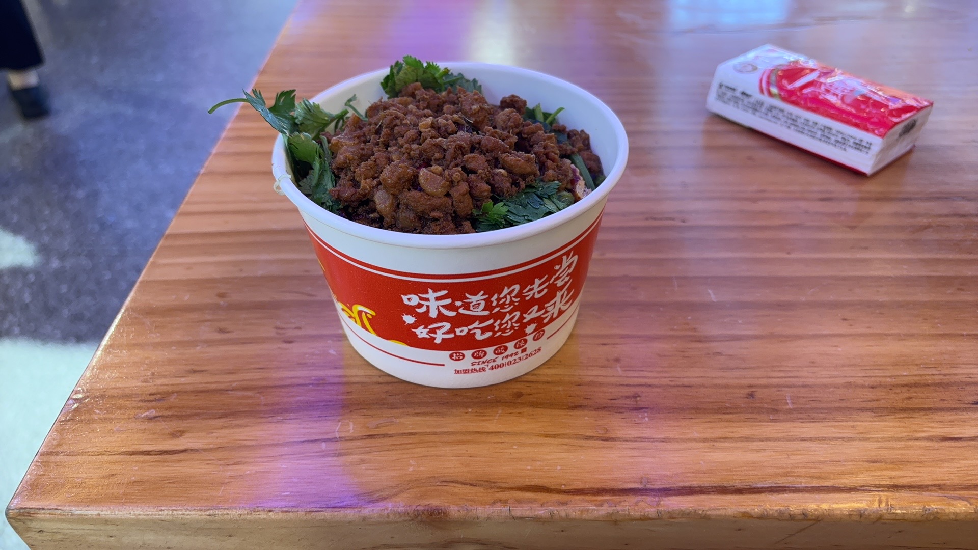 第二天,早上去吃了重庆小面。说是重庆小面,我姐告诉我一般正宗的重庆小面都不叫重庆小面,我想也是,就像四川川菜的店铺不可能说店名就叫川菜,但奇怪的是陕西的陕菜确实标榜自己是陕菜(乐)。我们吃的那家是叫什么凳凳面,吃饭的方式也很奇特,一个大椅子用来放吃的,人坐在小凳子上吃。我点了一份豌杂面,辣度应该是标准辣。本来以为自己吃不了这种辣,结果发现还好,确实是比平时的辣度更高,但是这个辣的很有滋味,看得出来调料很有一手,观察面的话发现汤居然是黑的,这是说明它辣的发黑吗?我在西安吃过几次重庆小面,每一次都给我劝退得不行,要不然辣的遭不住,要不然面吃着一股方便面的味道,今天尝了下正宗的确实不一样。