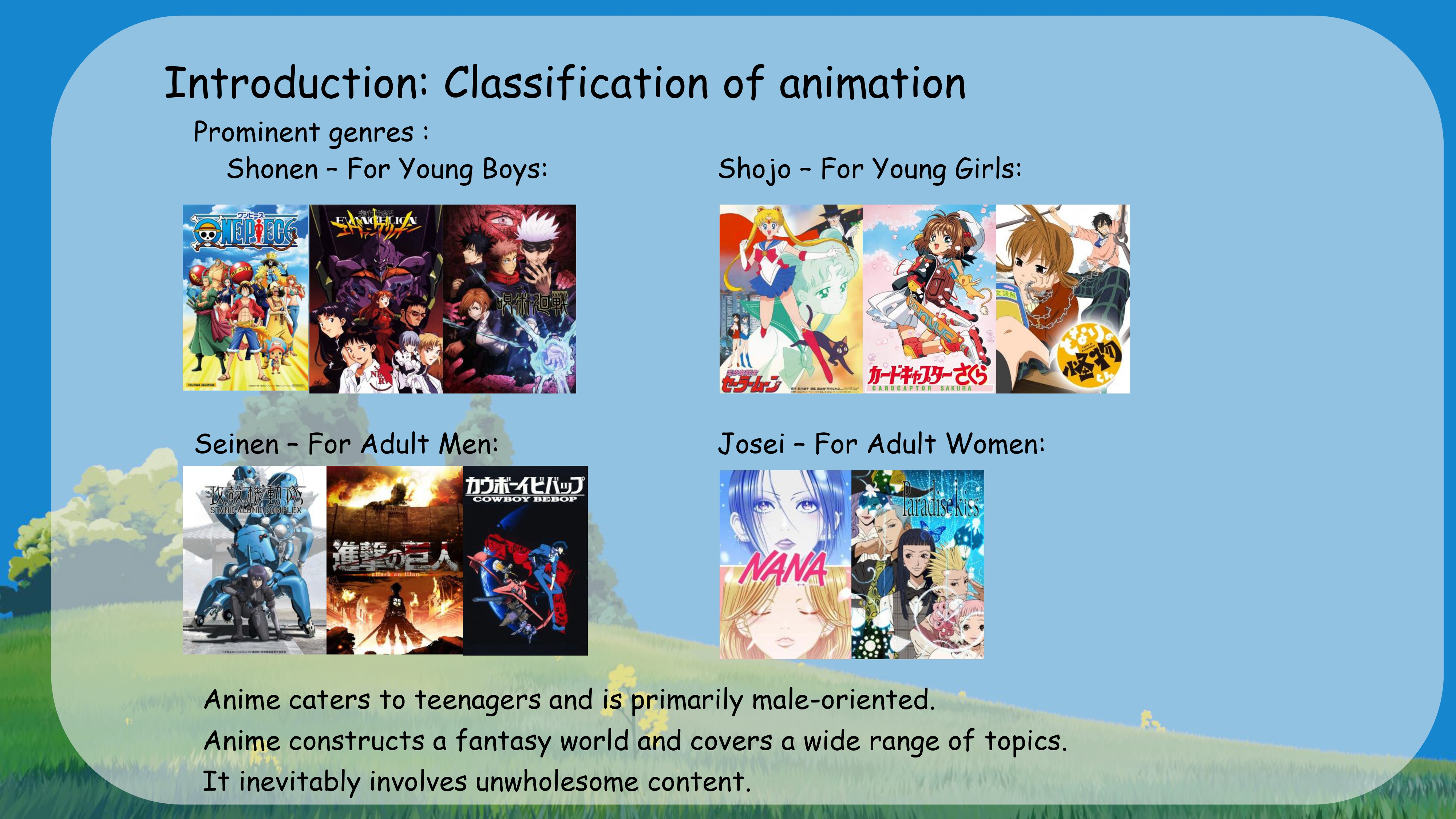 ...From this, we can see that anime often targets teenagers, with a significant portion aimed at male audiences. It frequently constructs fantasy worlds and covers a wide range of themes. However, it sometimes includes content that may be considered inappropriate.