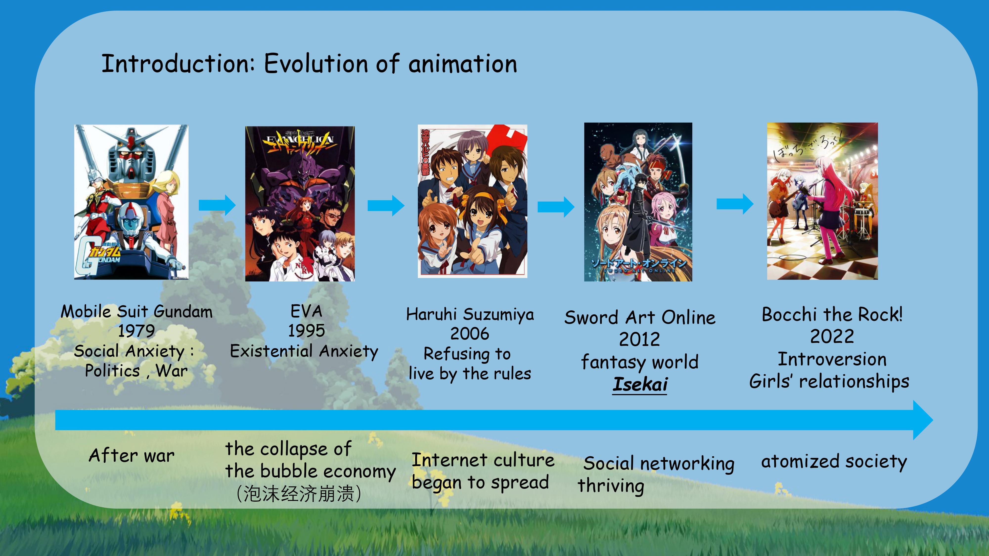 - Neon Genesis Evangelion: Created after the collapse of Japan’s bubble economy, it delves into existential anxiety—questions like "What is the meaning of my existence?" and "How should I relate to others?"