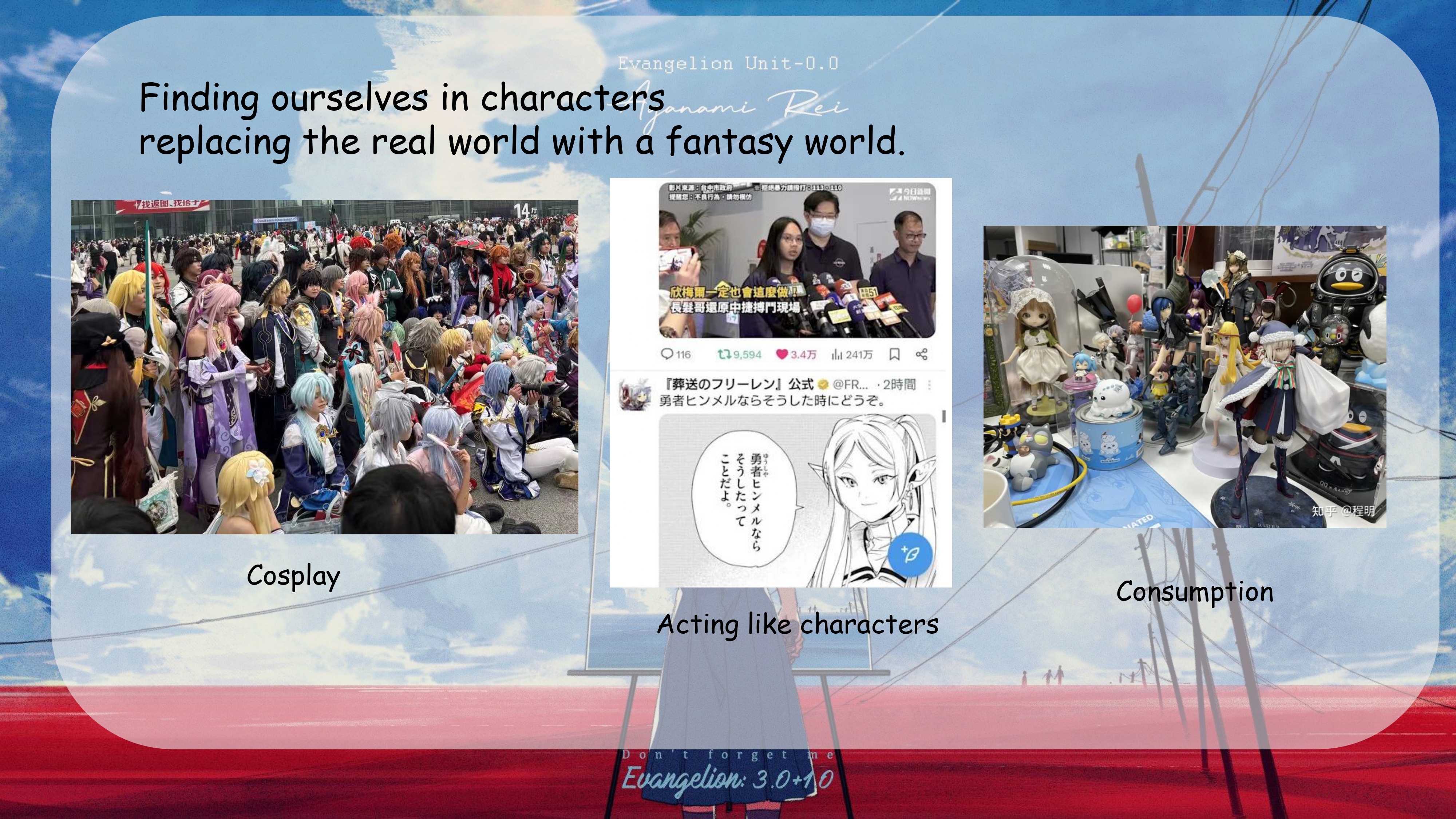 Take cosplay, for example. By dressing up as fictional characters, we spiritually seek acceptance and identity by imitating their actions and values. There was a young person in Taiwan who performed a brave act because they believed the protagonist in an anime would have done the same. We spend hundreds or even thousands money on merchandise of virtual characters, much like how we maintain relationships in real life. We watch characters in stories overcome great obstacles and find their "One Piece," yet in reality, a common cold can ruin an entire day.
