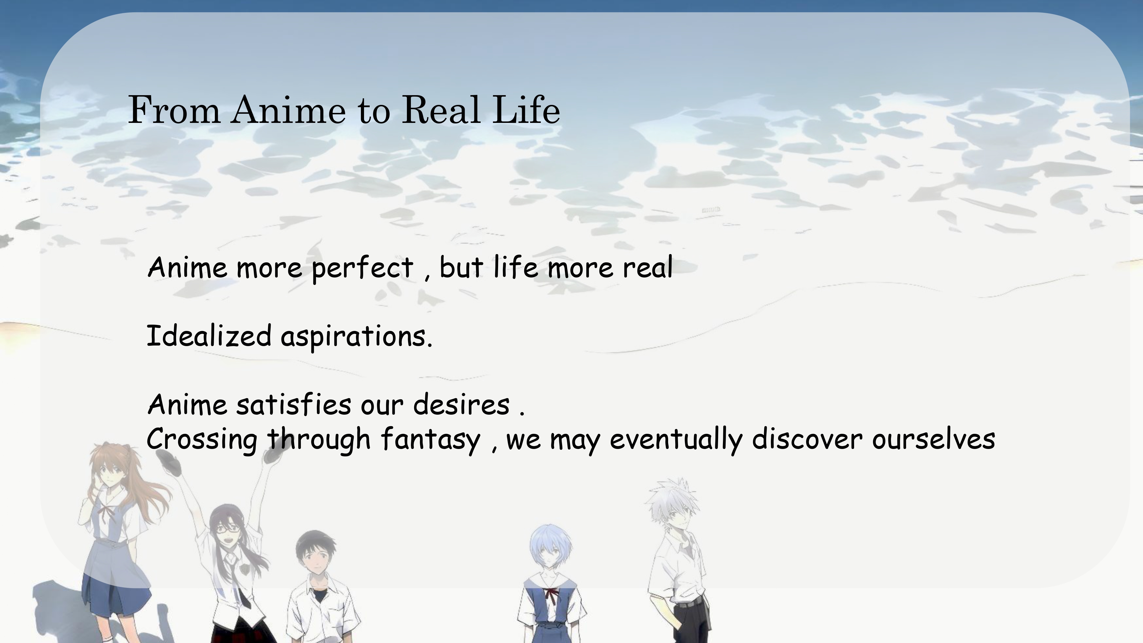 Perhaps anime simply satisfies our desires. What we need to do is not lose ourselves in it but face our desires head-on. As we encounter various fictional and real individuals, navigating through both reality and fantasy, we may eventually discover the kind of person we truly want to become.
